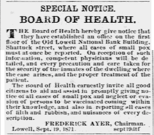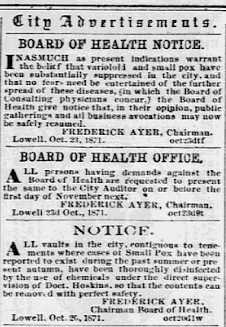 A prominent resident of Lowell since 1855 when he joined his brother in the patent medicine business and an alderman for many years, Frederick was described as “a leader because others were proud to follow” and “powerful because he was kind and just.” On September 15 he arrived at a special meeting convened by the City Council carrying a petition signed by hundreds of Lowell residents protesting the efficiency of the Board of Health and urging “prompt and efficient action” against the smallpox epidemic. A hefty debate with a “political tone” ensued, which resulted in Frederick Ayer and four other aldermen being “declared the [new] Board of Health, — thus having imposed upon us onerous duties and a grave responsibility, against our will and most earnest protest.”