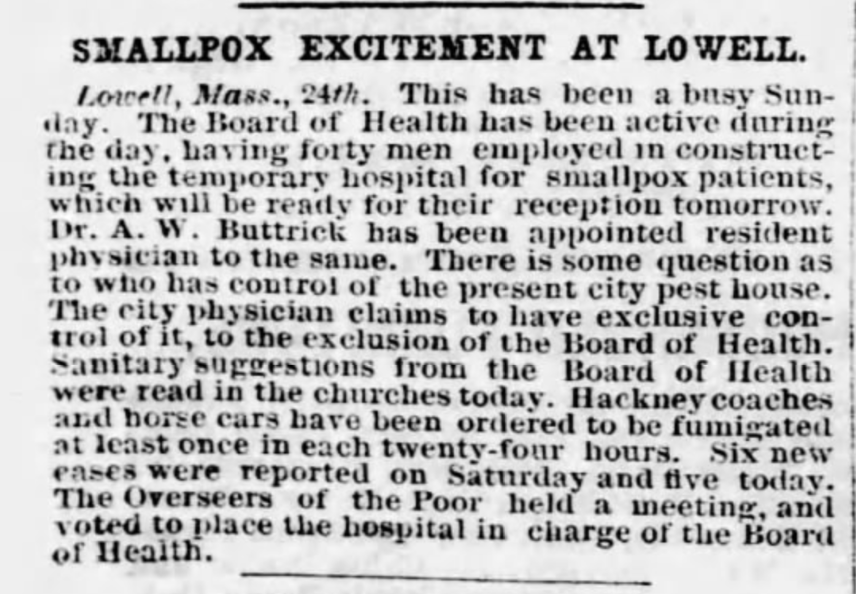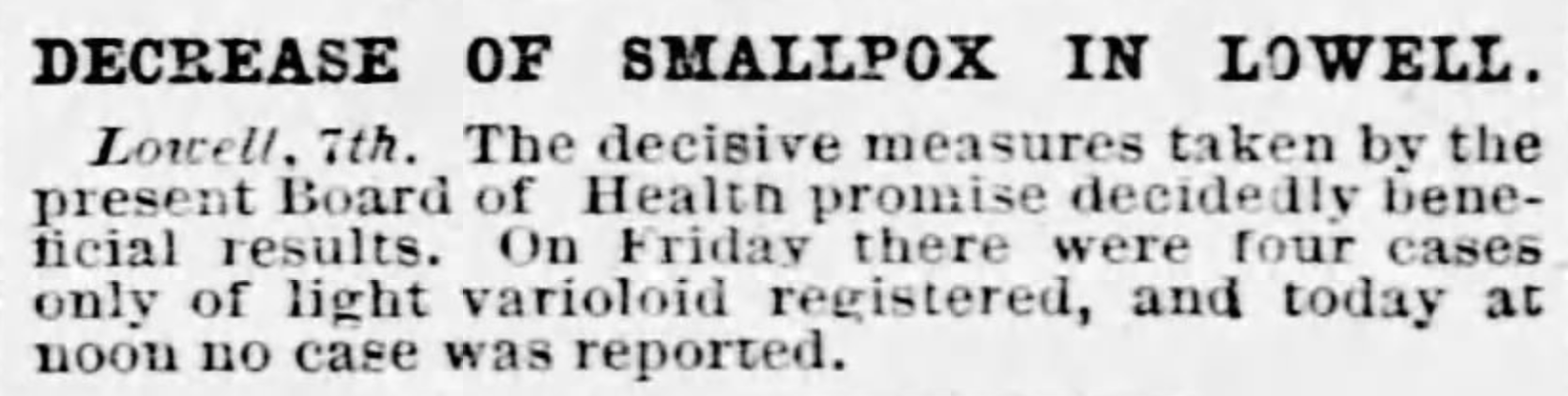 • “Small-pox.: How The Disease Was Exterminated In Lowell, Mass.” New York Times (1857-1922), Dec 25, 1872.