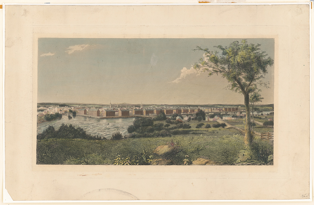 View of Lowell, Massachusetts at the confluence of the Merrimack and Concord rivers, with a row of textile mills or factories mainly along the Merrimack River. – Lowell New Hampshire Massachusetts Merrimack River, None. [Place not identified: publisher not identified, between 1840 and 1860] Photograph. https://www.loc.gov/item/94515606/.