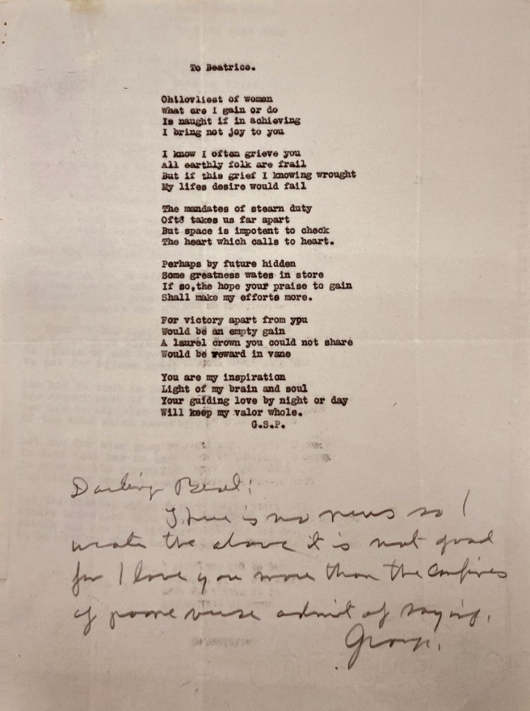 Collier’s, however, declined to print “The Song of the Bayonet,” explaining to Beatrice that “nothing more should be printed that will revive the “Old Blood and Guts” legend.” Yet there was a more sensitive side to George which was reserved just for Beatrice.