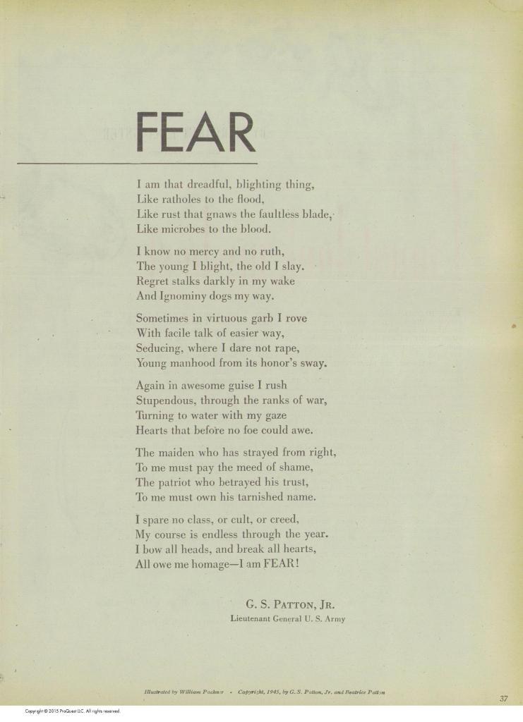 George’s vivid imagery describing both the horrors and glories of war were not appreciated in 1919 and Beatrice’s proposal was rejected, but all that changed during WWII when General Patton gained fame and reporters clamored for any piece of information they could get on him. Beatrice took advantage of the opportunity and renewed her effort to publish George’s work, knowing how much it would mean to him. She couldn’t believe her luck when Woman’s Home Companion paid $50 in October 1943 to print “God of Battles,” followed by Cosmopolitan in early 1945, which published “Fear.”