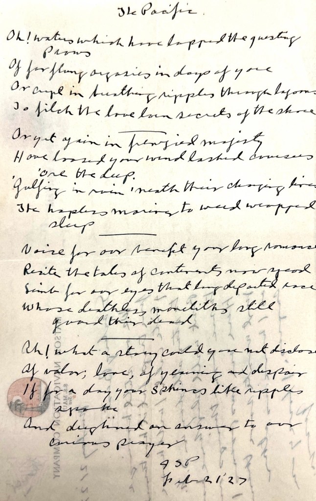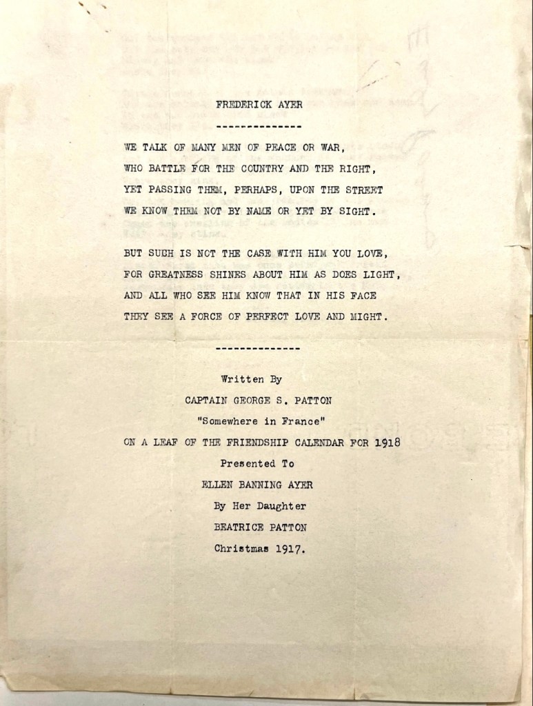George Patton considered himself to “have a hell of a memory for poetry and war.” An astute student of military history, he could also conjure up a poem appropriate to any situation. Raised on the verses of Kipling and Homer, during times of war when he couldn’t sleep, George liked to pick up the pen and write poetry to cheer and inspire himself. Many a letter to Beatrice during the Mexican Punitive Expedition and WWI included a sheet of poetry, imploring her not to lose it as “they may be priceless some day.”