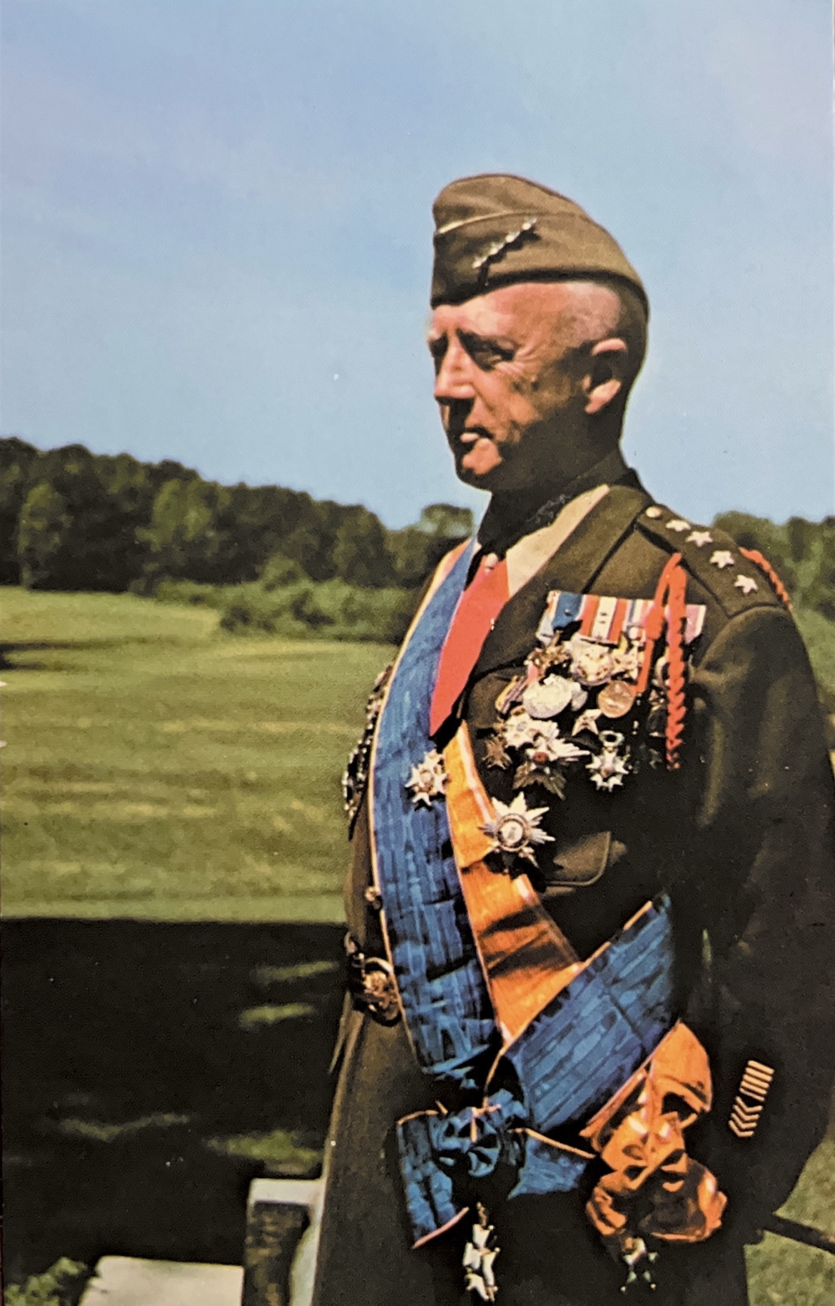 The inspiration behind the memorable opening scene of Patton is a photograph taken in June 1945 at General Patton’s home in South Hamilton, Massachusetts. He had just completed a war bond-selling tour throughout the United States and was enjoying his first real vacation since March 1940. Unlike George C. Scott’s Patton, the real George Patton never simultaneously wore all his medals and ribbons. That one day on the back porch of Green Meadows, he only did so at the request of his close friend, Dr. Peer Johnson.