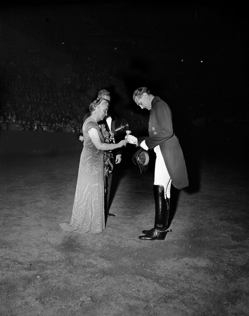 A red carpet was unrolled, and out walked General Tuckerman, the director of the National Horse Show, with Mrs. Patton, wearing a floor-length evening gown and carrying a bouquet of red roses. A single spotlight followed Col. Podhajsky as he dismounted Pluto and approached Mrs. Patton, “I am very happy to be able to show you the horses that General Patton, a great American soldier, saved for Austria.” Beatrice took a single rose from her bouquet and handed it to the Colonel as flashbulbs lit up the darkened Garden,